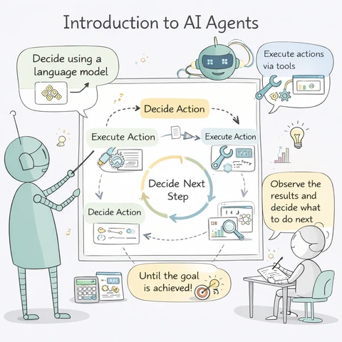 An AI agent is a system that uses a language model to decide which actions to take, executes those actions (via tools), observes the results, and then decides what to do next — repeating this cycle until a goal is reached.
